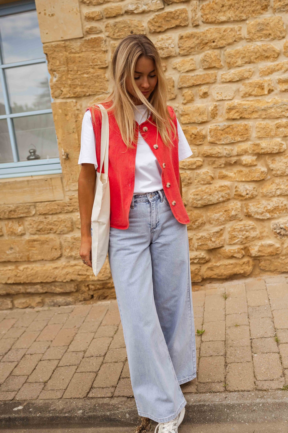Carla™ Vintage sommervest bringer liv til din sommergarderobe med sin stærke farve og slidte finish. Et alsidigt stykke med afslappet pasform, perfekt til at bære over T-shirts eller lette toppe – ideel fra forår til efterår.